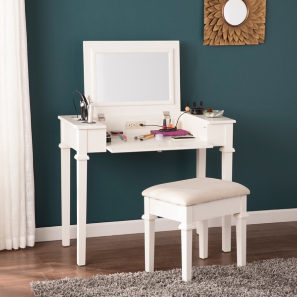 White Vanity Desk With Stool And Power Outlet Kirklands